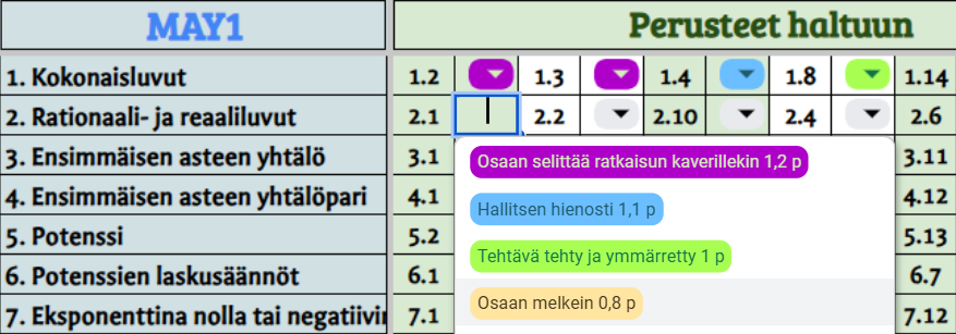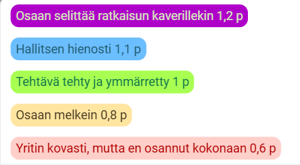 Opiskelija arvioi valikosta millä tasolla hän tehtävän hallitsee ja saa sen perusteella tehtävästä pisteitä.