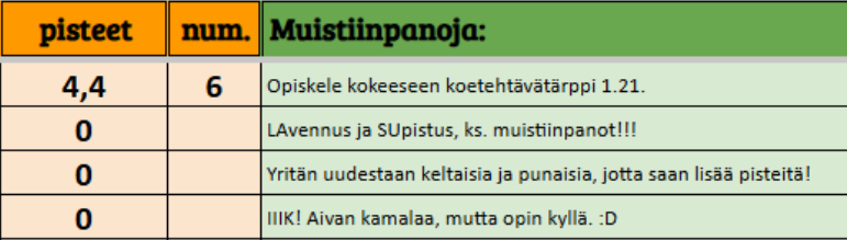 Numeroiduissa sarakkeissa 1-16 listautuu luvuista saavutetut arvosanat ja sarakkeessa 17 kokonaispistemäärä kaikista tehtävistä. Arvosana tehtävistä on seuraavassa sarakkeessa.