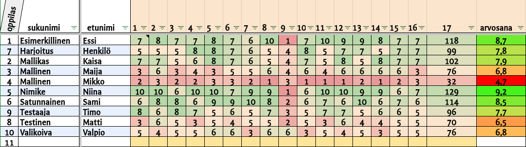 Värikoodeista on nopeasti havaittavissa ongelmakohdat, kuten opiskelijoiden 3, 4, 8 ja 10 mahdollinen lisätuen tarve. Lisäksi luku 9 on mahdollisesti koettu haastavaksi.